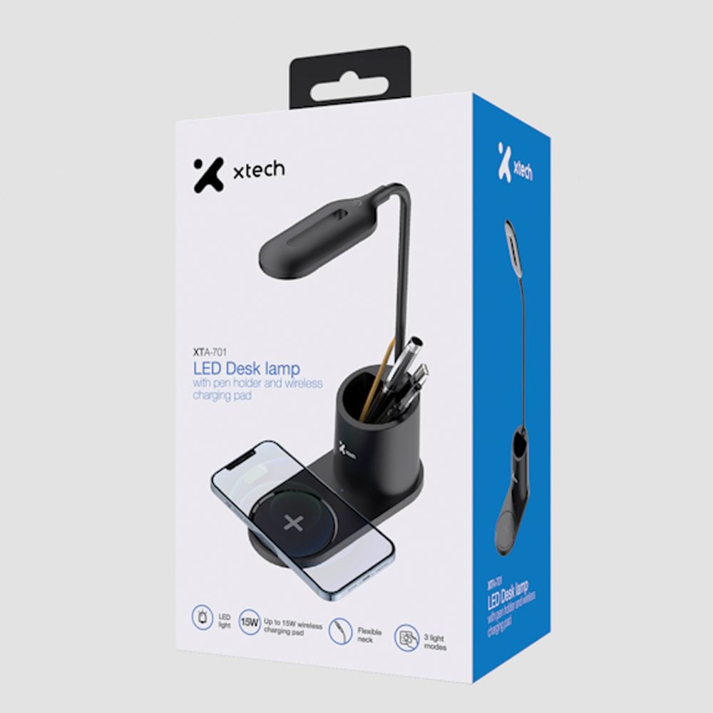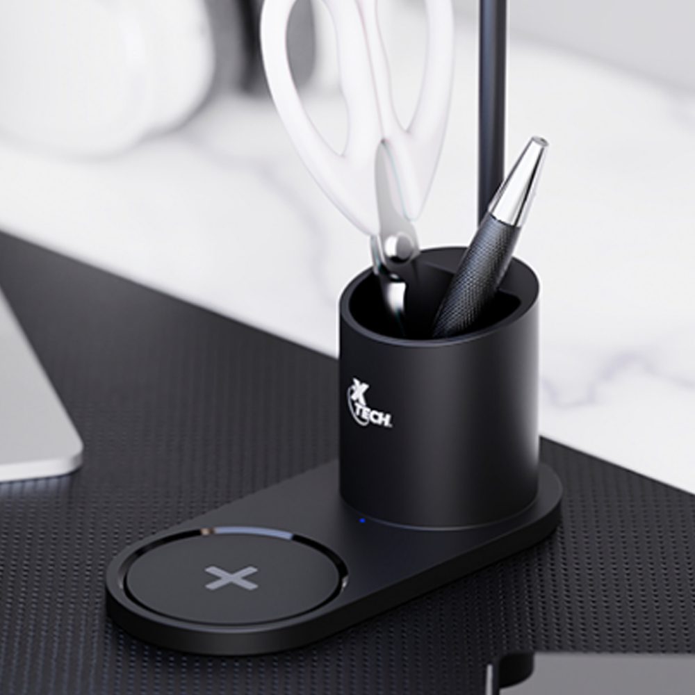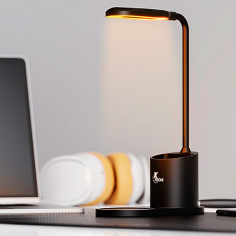 Esta lámpara cargador celular posee cuello flexible con 3 modos de luz LED: cálida, fría y blanca cálida. Con base de carga inalámbrica de 15W para tu celular. Incluye portalápices para mantener tus artículos de trabajo ordenados.