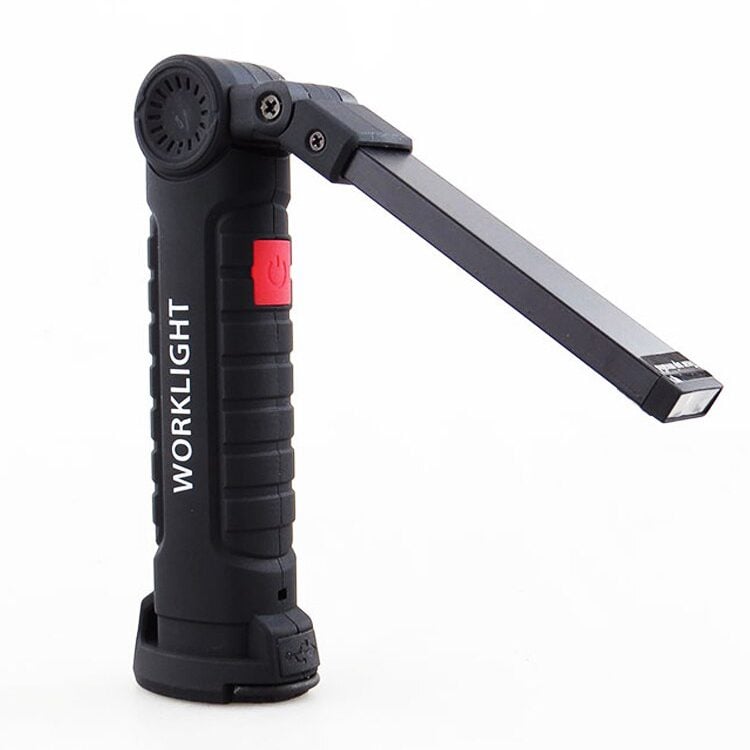 Esta linterna led de trabajo es una infaltable en cualquier trabajo técnico y/o mecánico y también para tener si o sí entre las herramientas de tu automóvil u hogar. Esta linterna posee ajusta en 360 grados, es plegable y además cuenta con 5 modos de luz diferente: Led frontal, lámpara led luz media, lámpara led luz alta, luz led roja y luz flash color rojo. Para convertirla en luz roja, sólo basta mantener presionado por 3 segundos el botón on/off. Además, su base posee un imán, que te permite sujetarla en superficies metálicas, además de un gancho para colgarla.