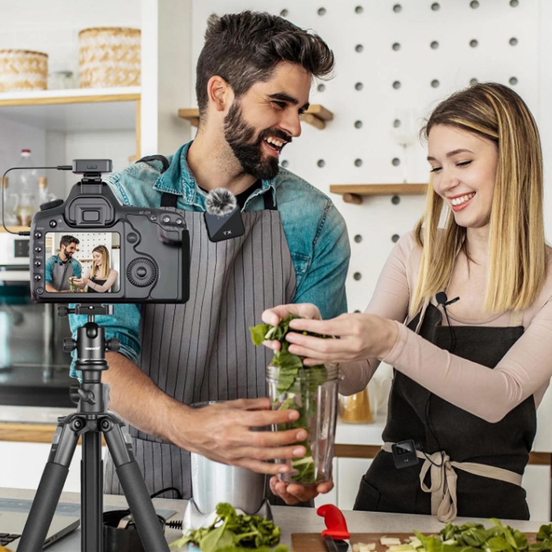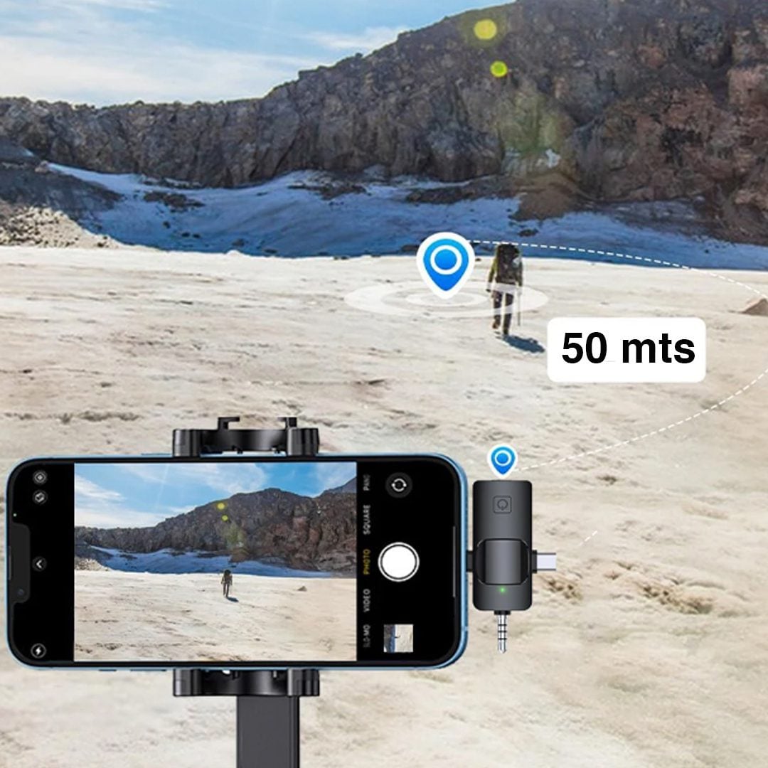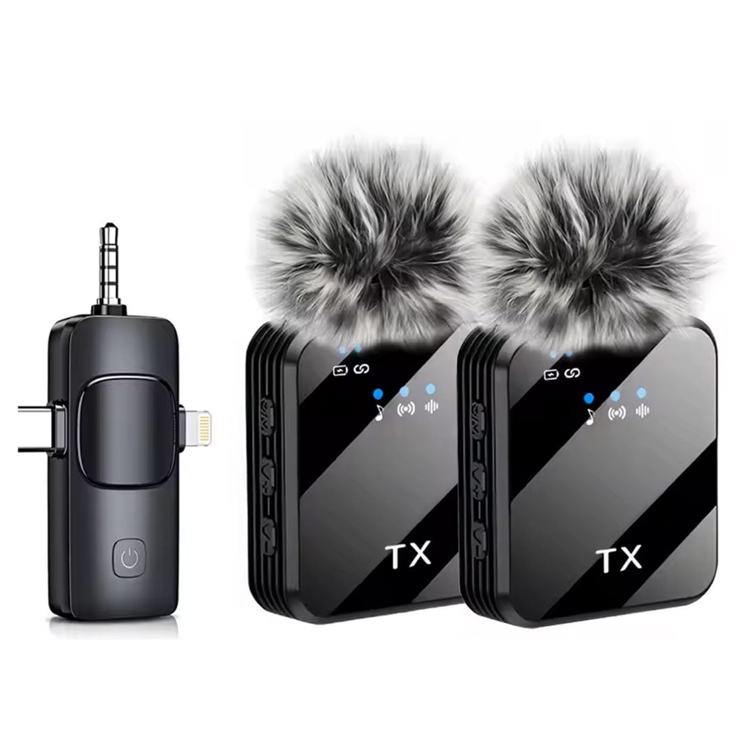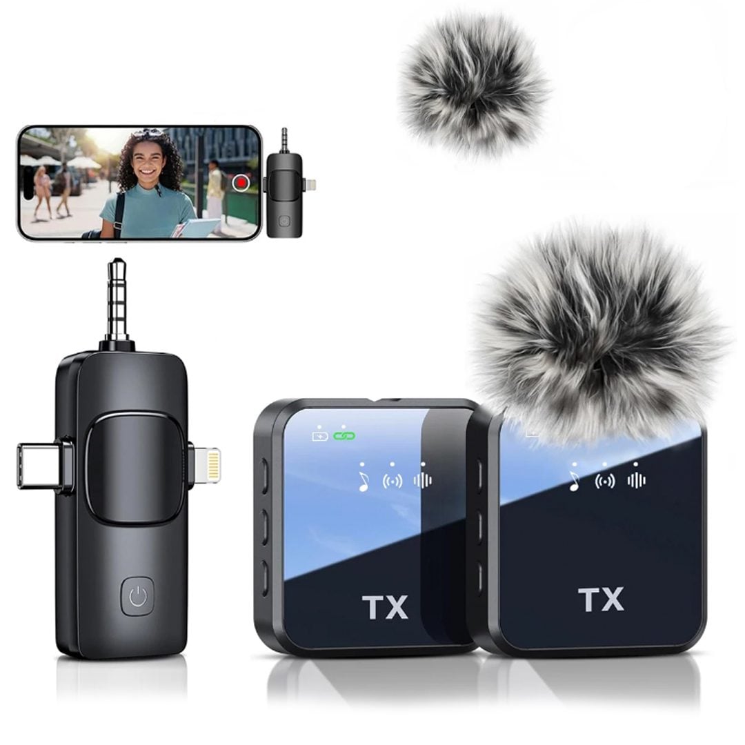 Micrófono lavalier inalámbrico dos unidades para tus lives, videos y podcasts, con amplia compatibilidad con tus dispositivos. El kit incluye dos micrófonos y un receptor para celular, con conexión USB C, lightning y jack de 3.5mm.