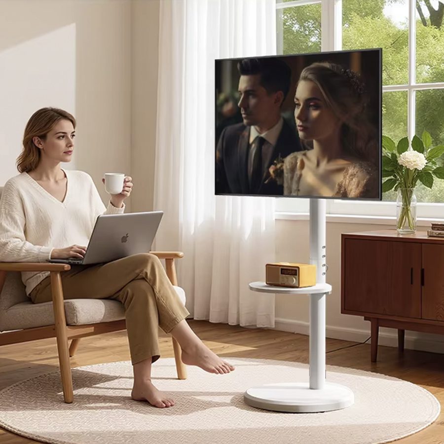 Este soporte TV con ruedas vertical y horizontal, es un pedestal que te permitirá trasladar tu pantalla, de TV o monitor a todos lados. Su diseño blanco, minimalista, es elegante y acorde con tu hogar. negocio u oficina. Posee ruedas en su base, para un traslado mucho más cómodo. Además incluye una pequeña mesa para colocar tu parlante, decodificador u otros dispositivos o adornos.