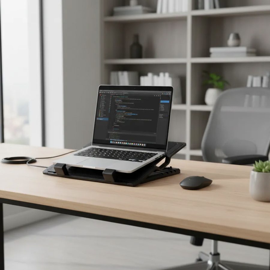 Importante: Este ventilador es para utilizar con teclado y mouse externos. Considera que al quedar elevado, tus antebrazos y muñecas quedarán en una posición incorrecta, causando incomodidad y, en el peor de los casos, lesiones por mala postura.